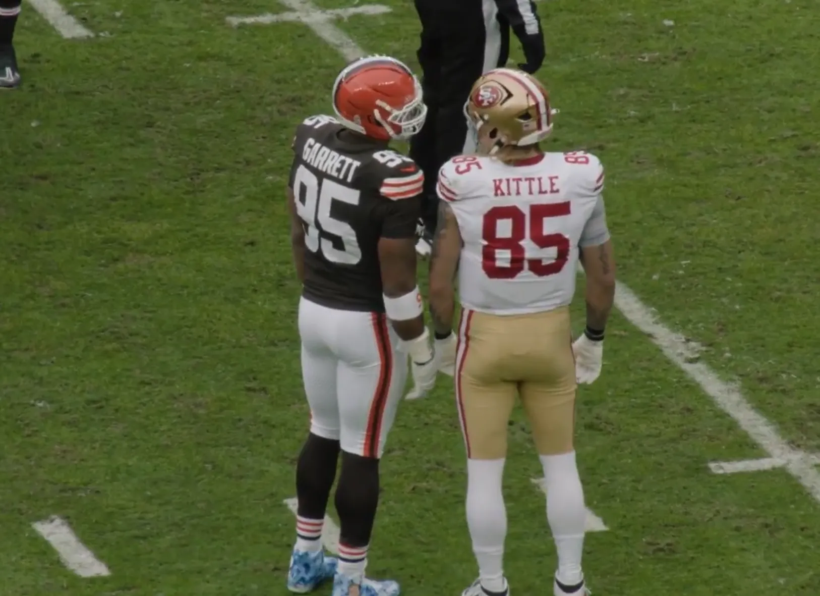 Cleveland Browns superstar edge rusher Myles Garrett and San Francisco 49ers All-Pro tight end George Kittle had a priceless one-on-one interaction before Sunday’s game at Huntington Bank Field.